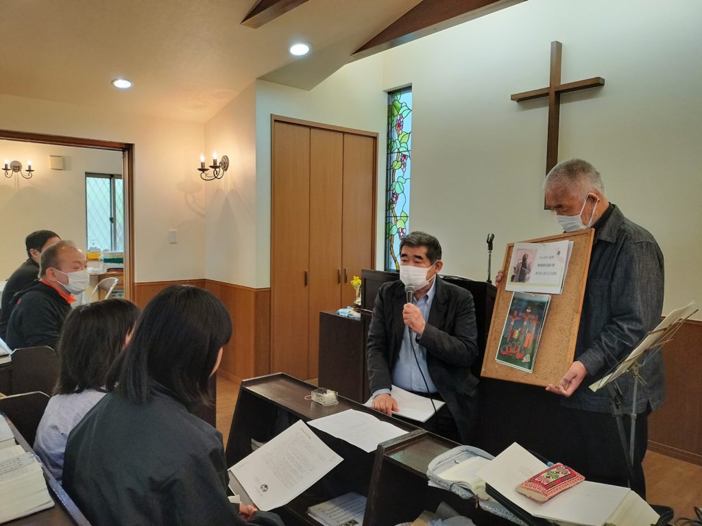礼拝の中で、有志による平和に関する証しの時間を持ちました。5人の方々からそれぞれの問題意識に添った発表がありました。賛美を通しての平和への思い、「非戦」と「避戦」についての考察、シベリア抑留者から聞いた貴重な体験、創造主なる神から人間に与えられている平和の務め、長崎の鐘に込められた平和への思い、等。一つ一つの真剣な証しに時間を忘れて聞き入りました。